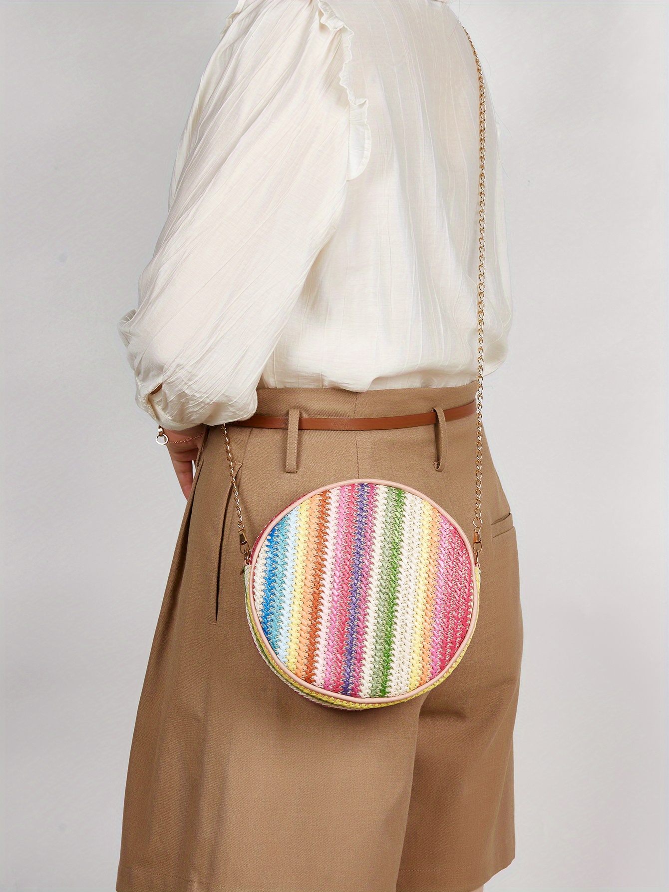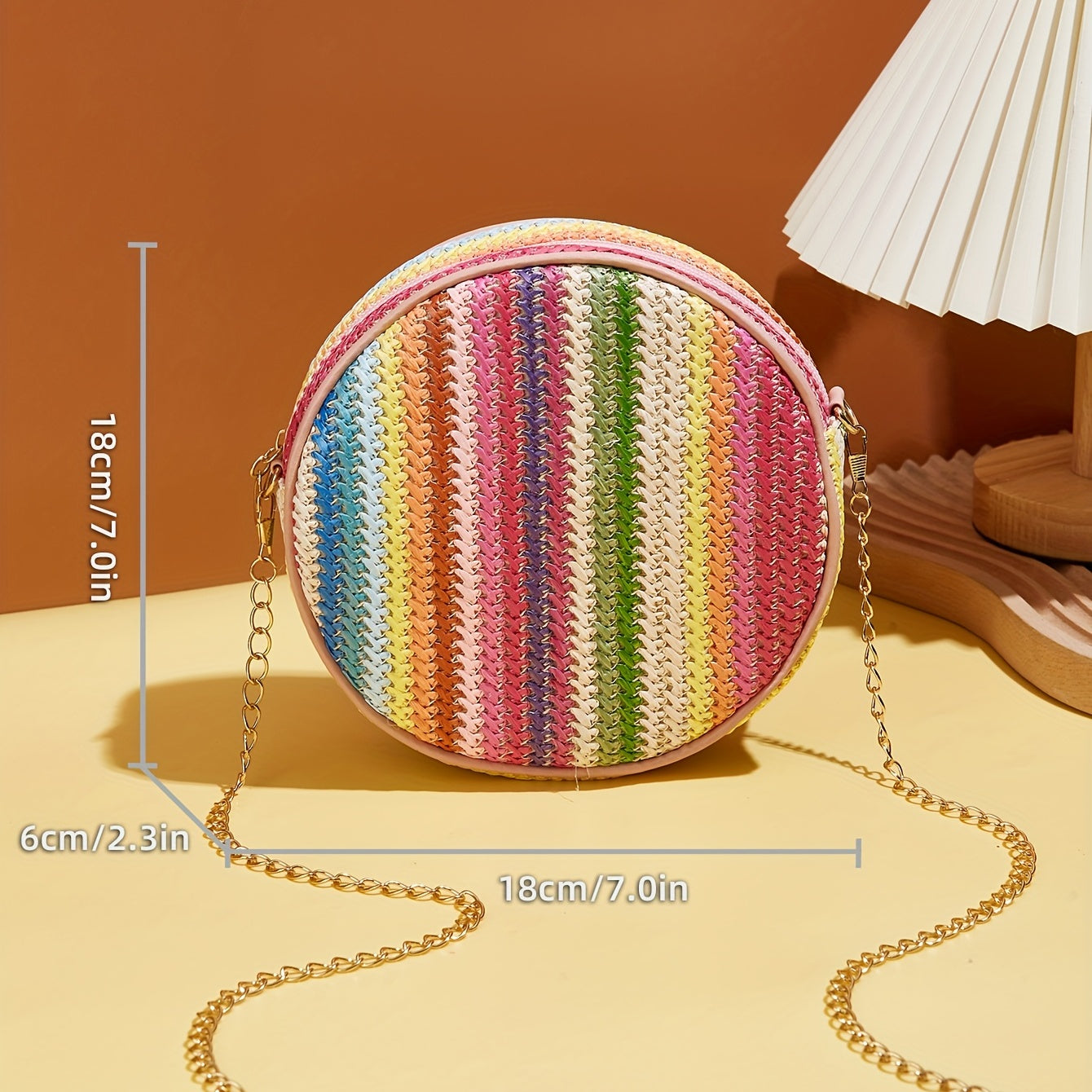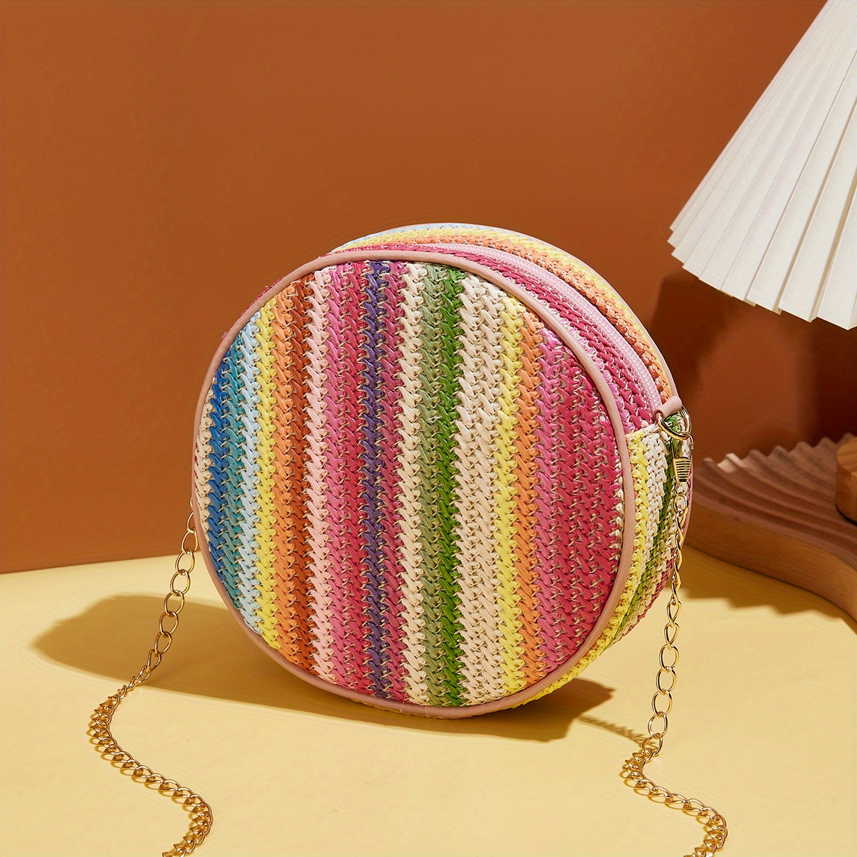 カラフル ストロー編み ラウンドバッグ|ファッション チェーン クロスボディバッグ|レインボーデザイン レディース ビーチバッグ