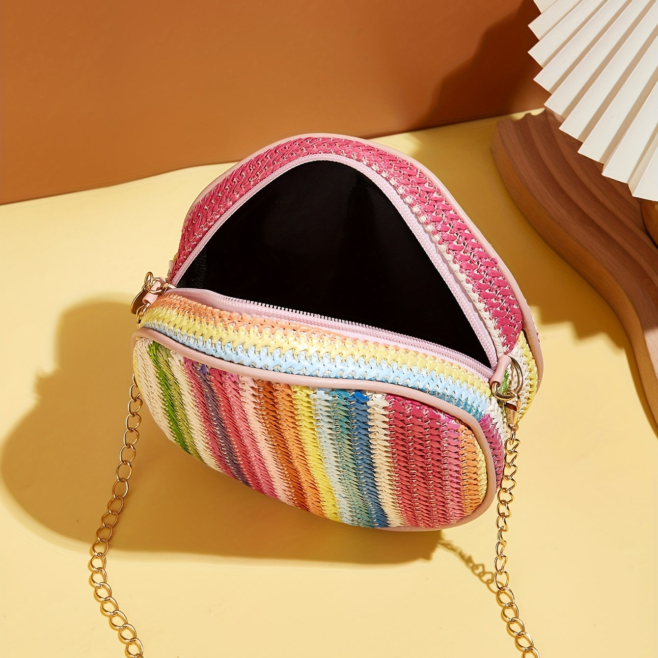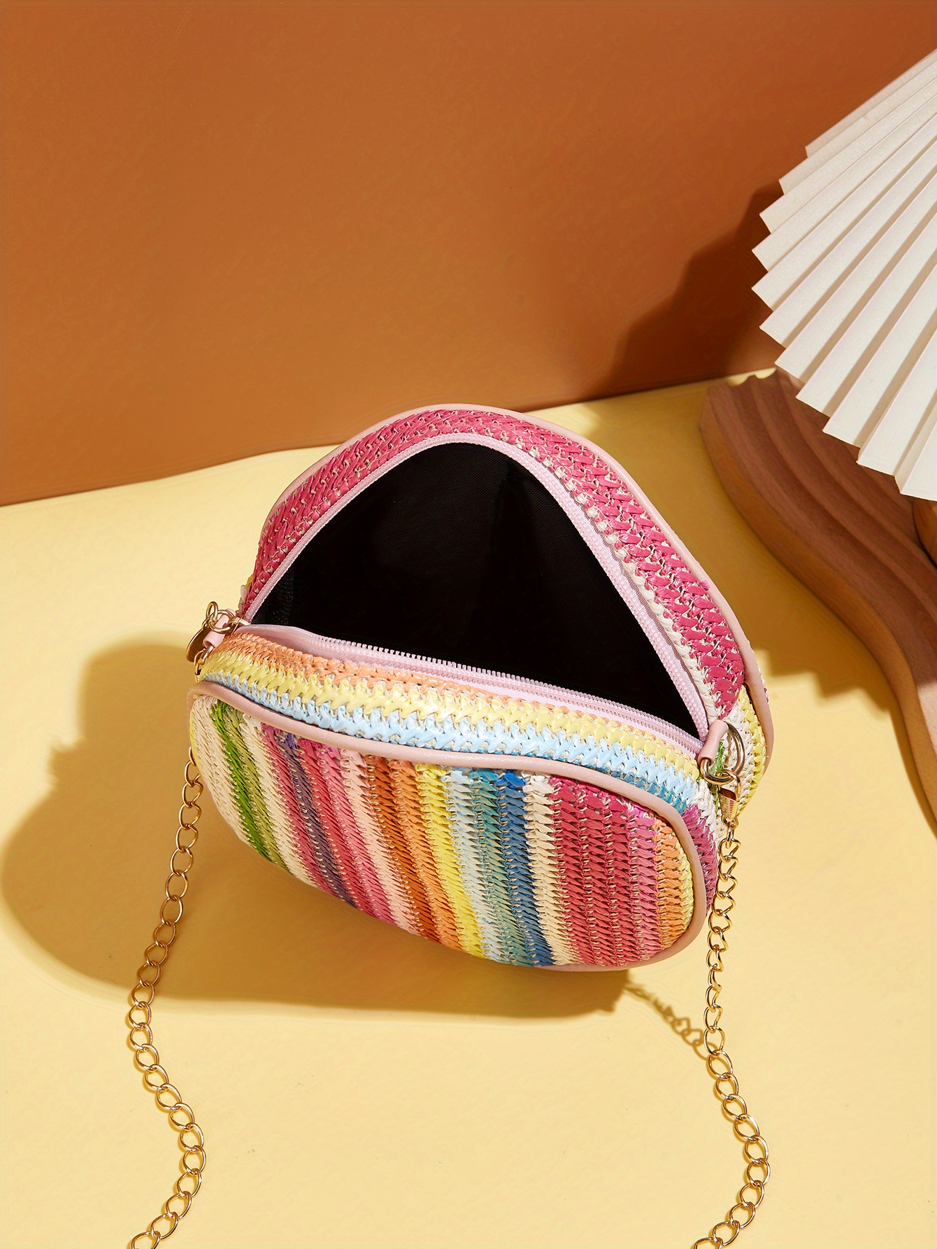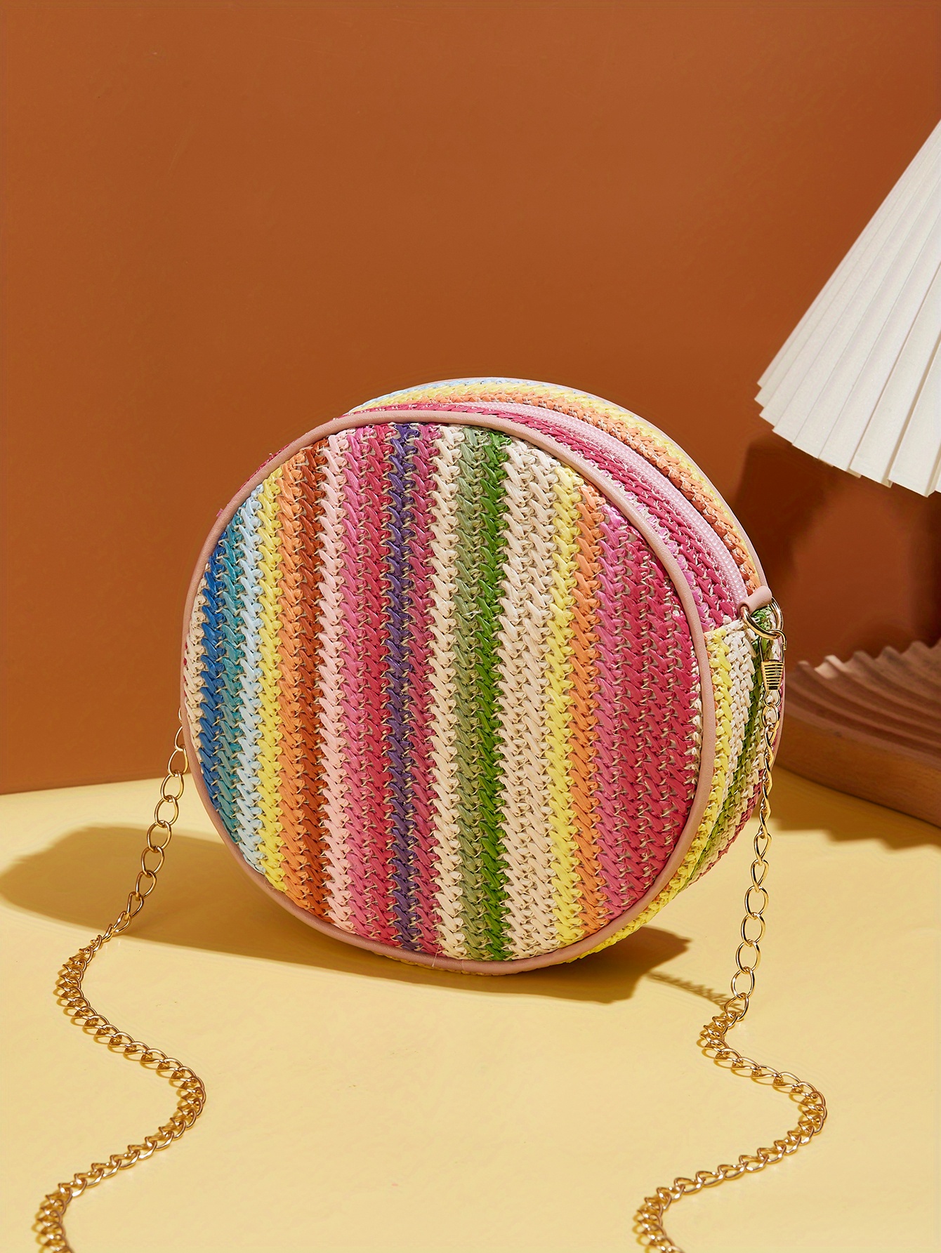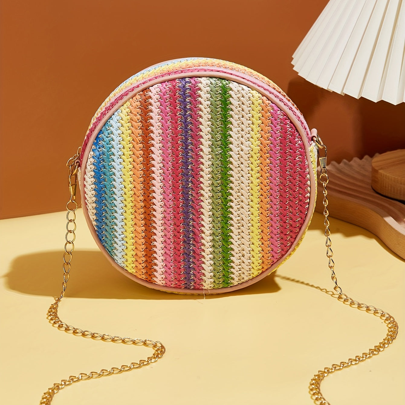 カラフル ストロー編み ラウンドバッグ|ファッション チェーン クロスボディバッグ|レインボーデザイン レディース ビーチバッグ