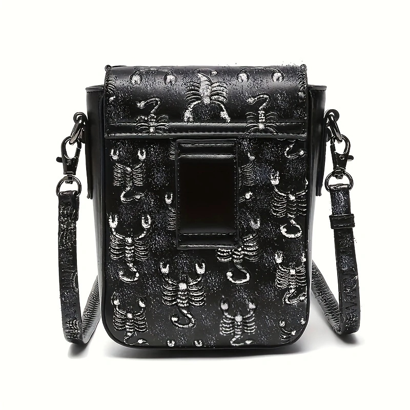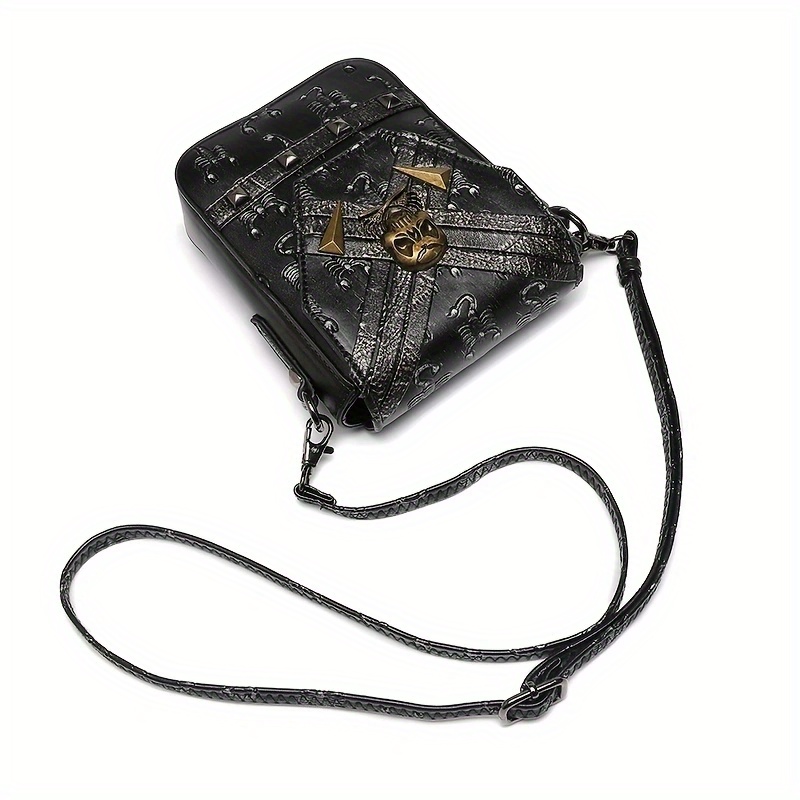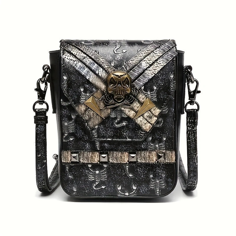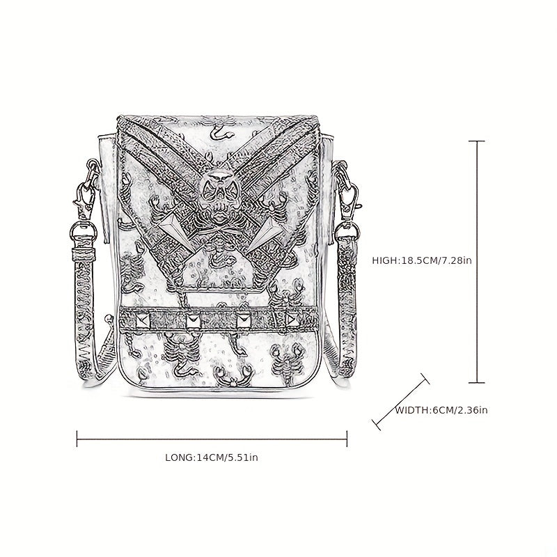 ミニ スチームパンク 型押し クロスボディバッグ|ハロウィン スカル フラップ パース|ゴシック PUレザー スマホバッグ