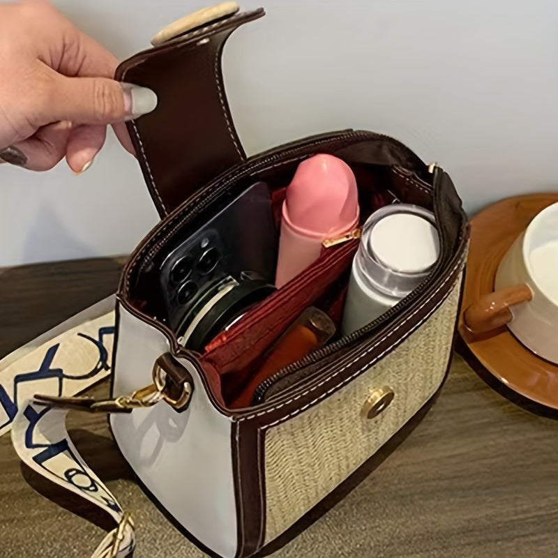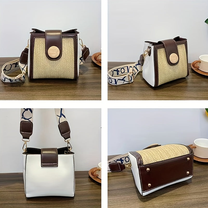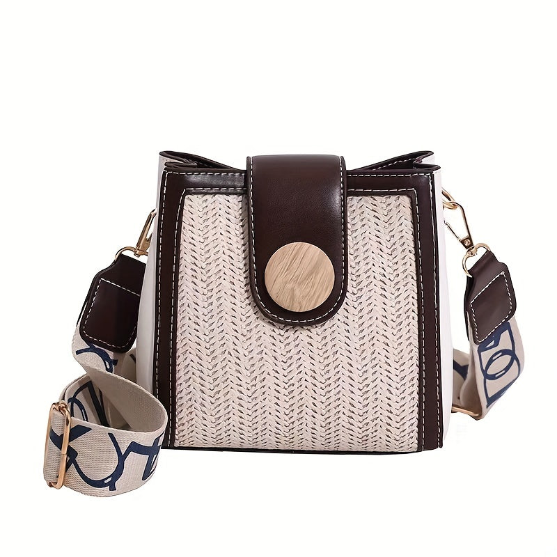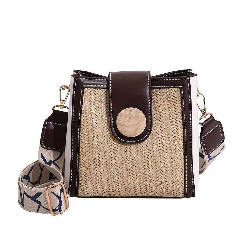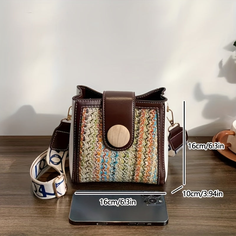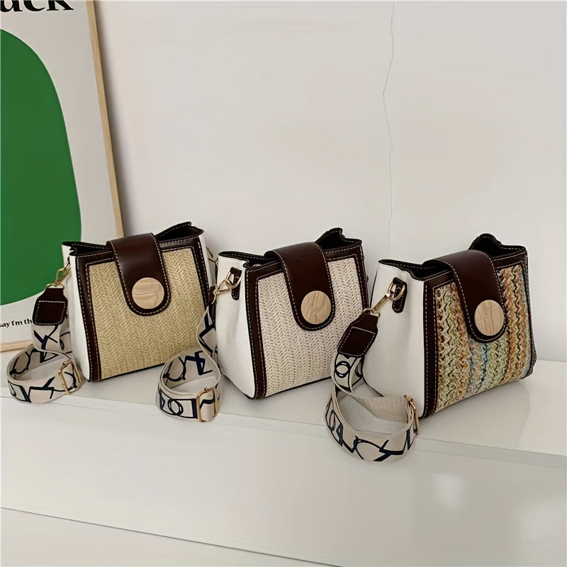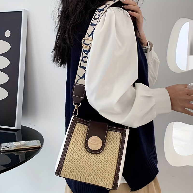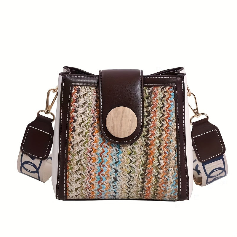 ストロー編み クロスボディバッグ|幅広ストラップ ショルダーバッグ|レインボーデザイン レディース バケットバッグ