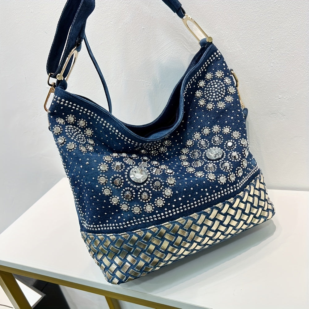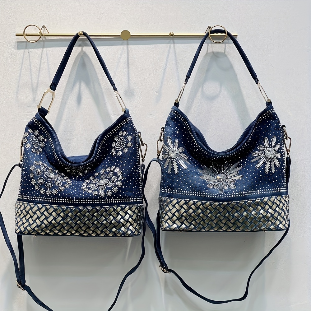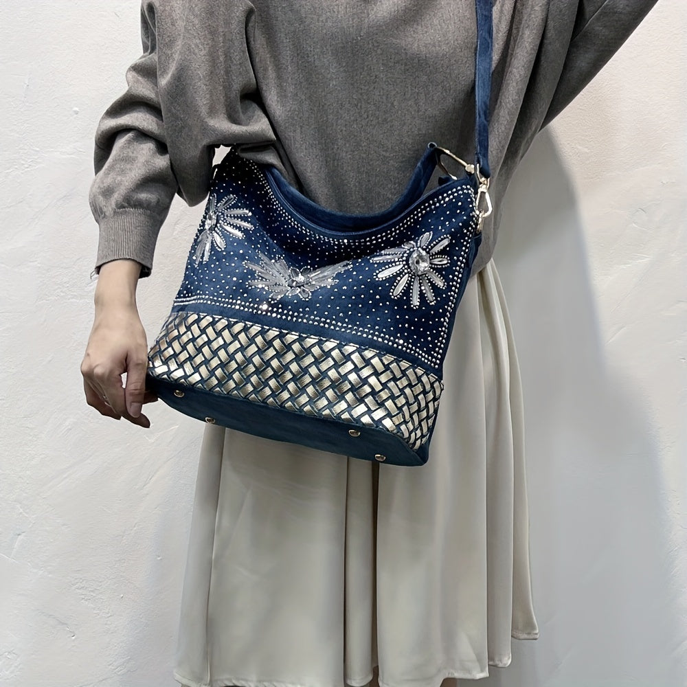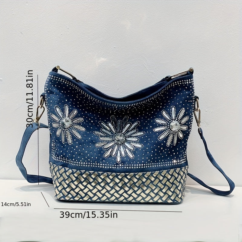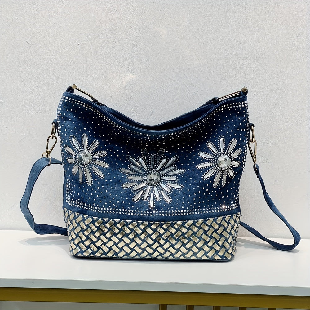 フラワー柄 ラインストーン装飾 ショルダーバッグ|トレンド デニム クロスボディバッグ|オールマッチ レディースバッグ