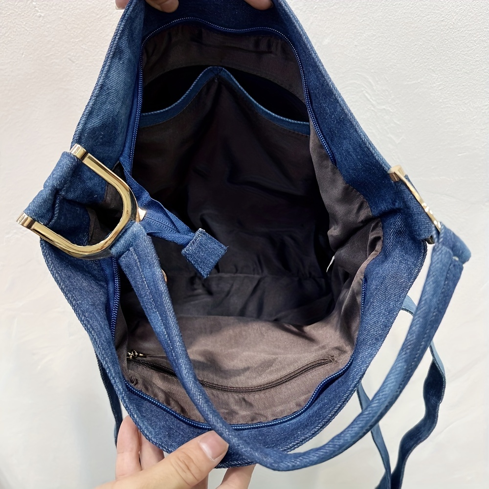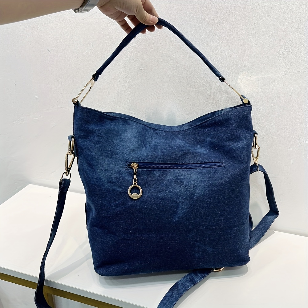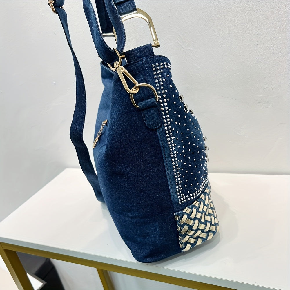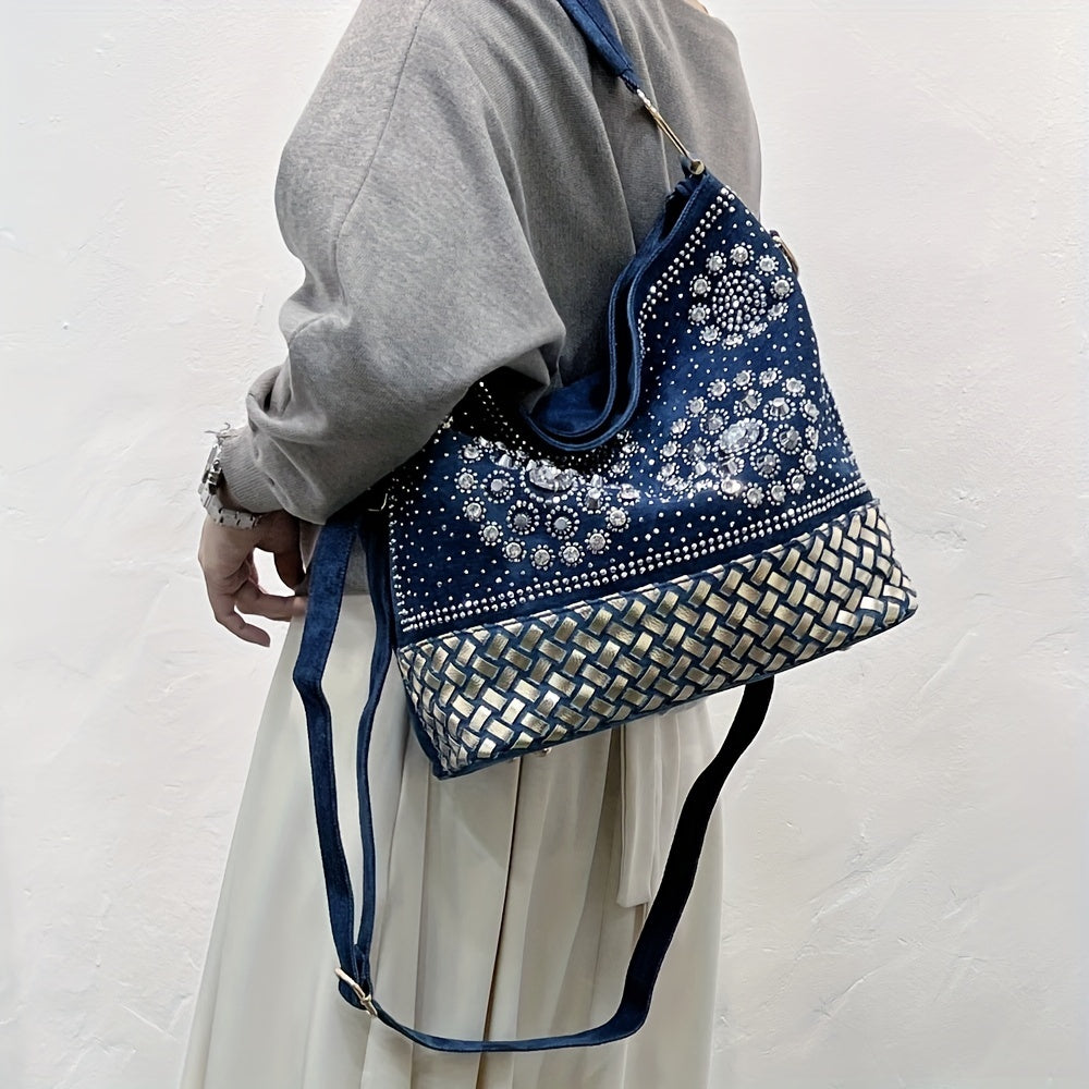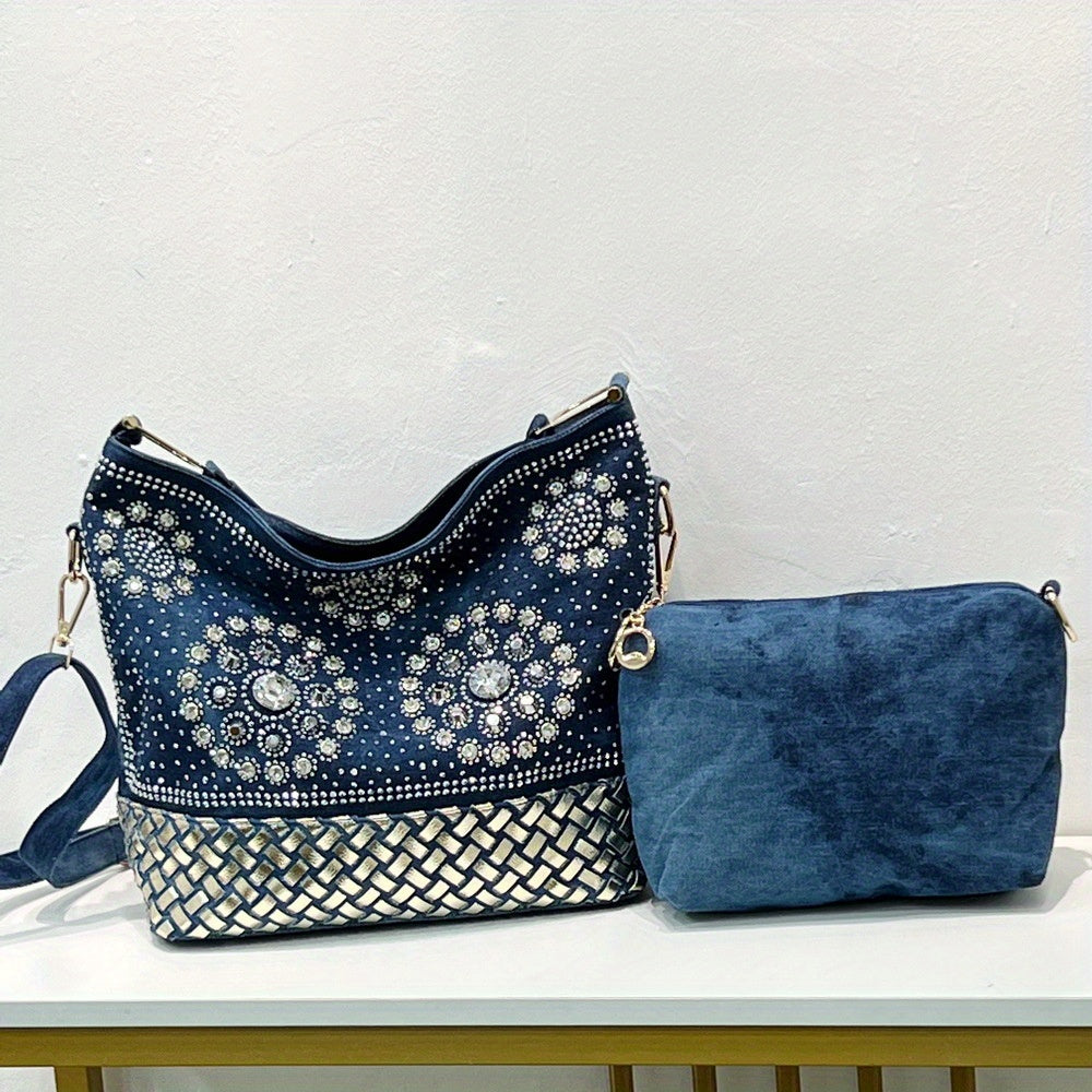 フラワー柄 ラインストーン装飾 ショルダーバッグ|トレンド デニム クロスボディバッグ|オールマッチ レディースバッグ