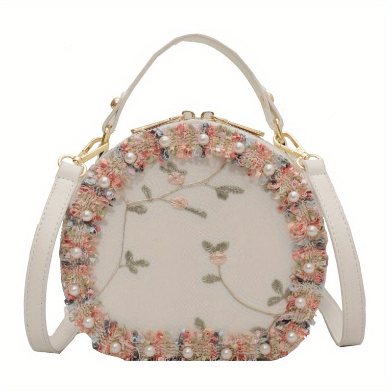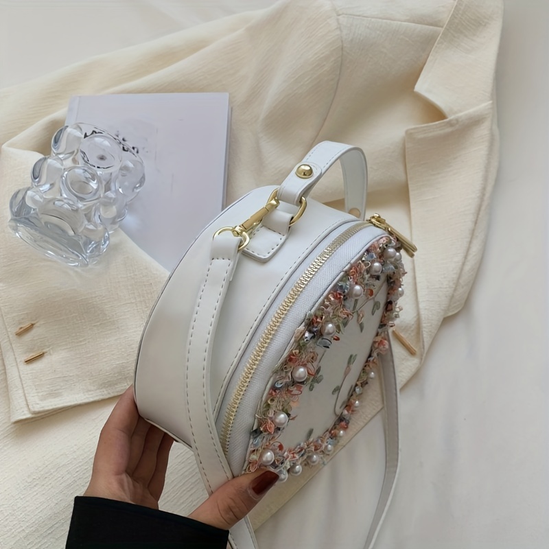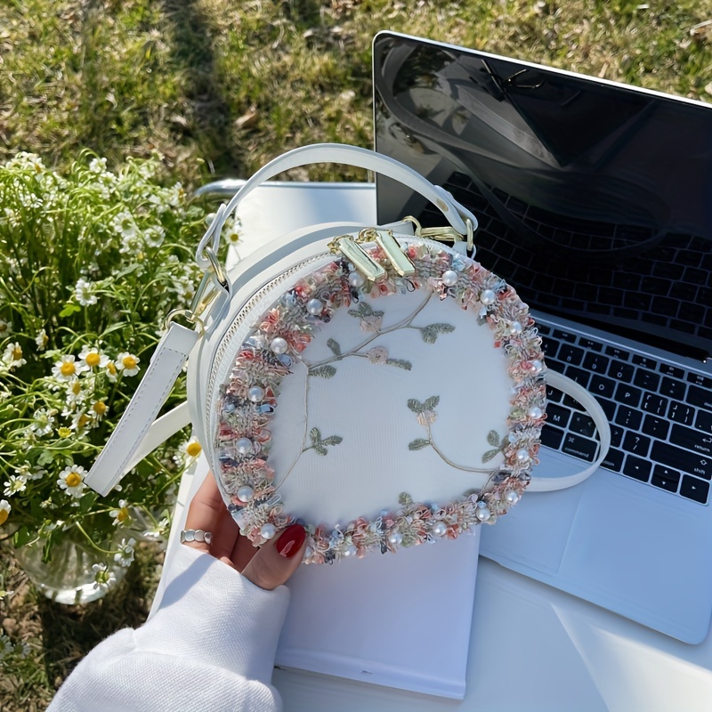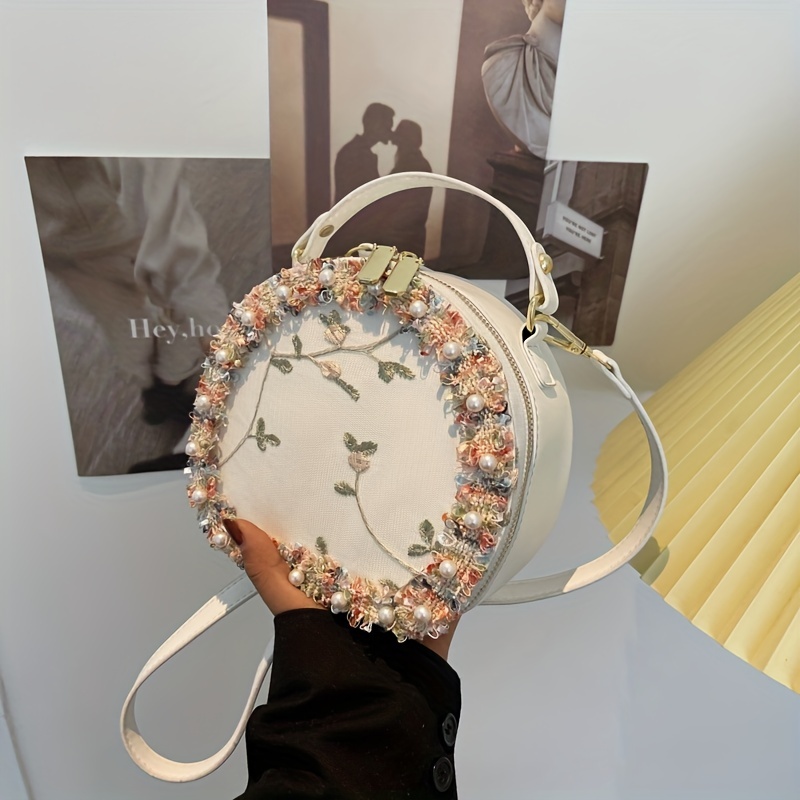 トレンド フラワー刺繍 ラウンドバッグ|ビーズ装飾 サッチェルバッグ|ファスナー付き スタイリッシュ ショルダーバッグ