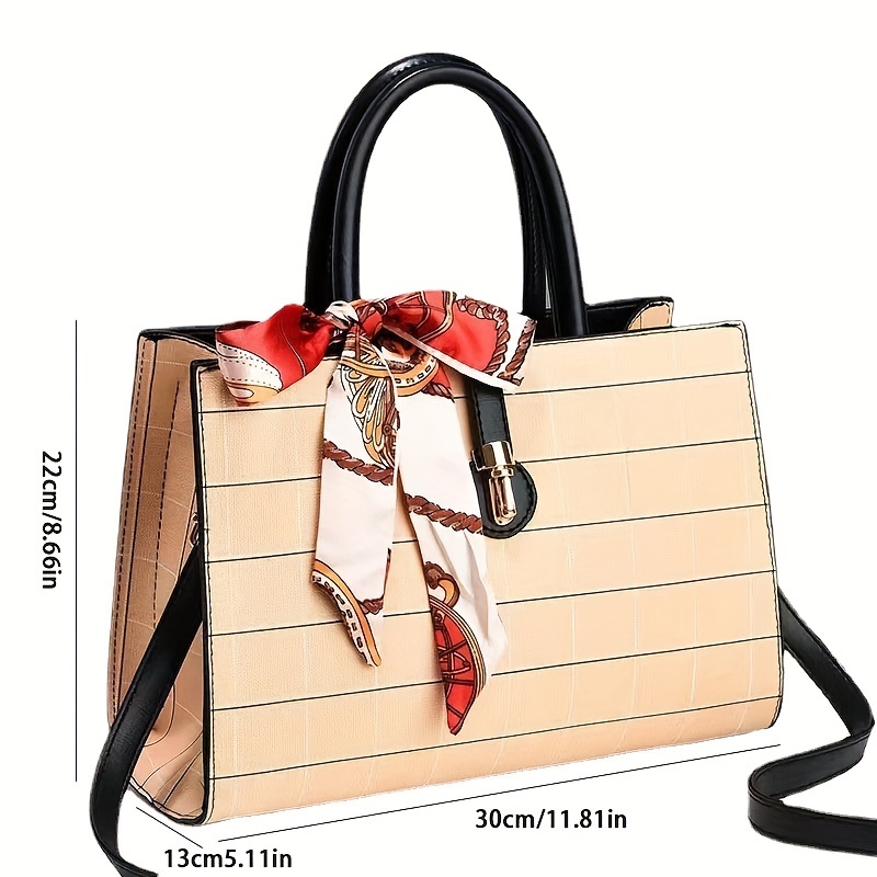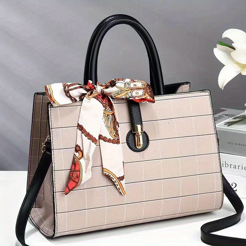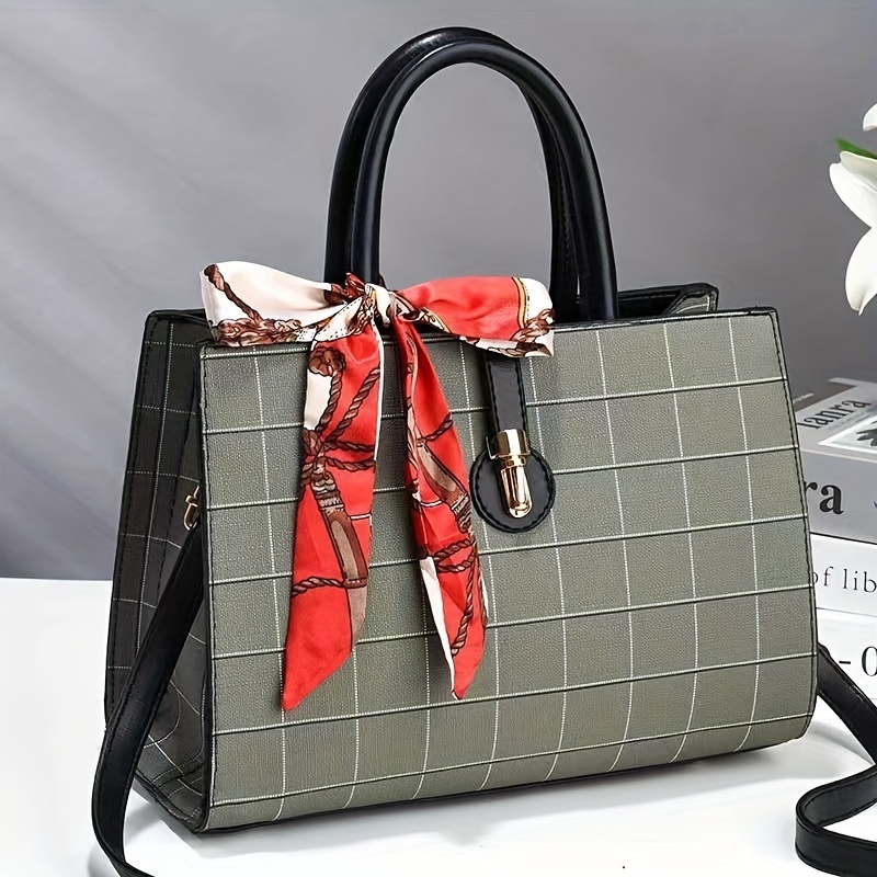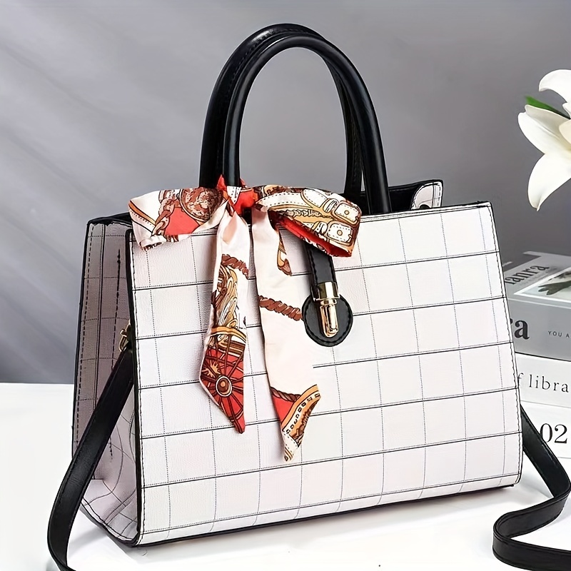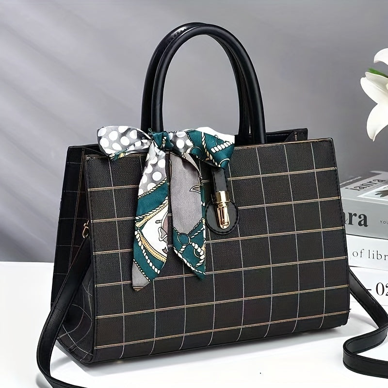 ウィンドウペーン柄 トートバッグ|スカーフ装飾 サッチェル パース|レディース 合成皮革 クロスボディバッグ
